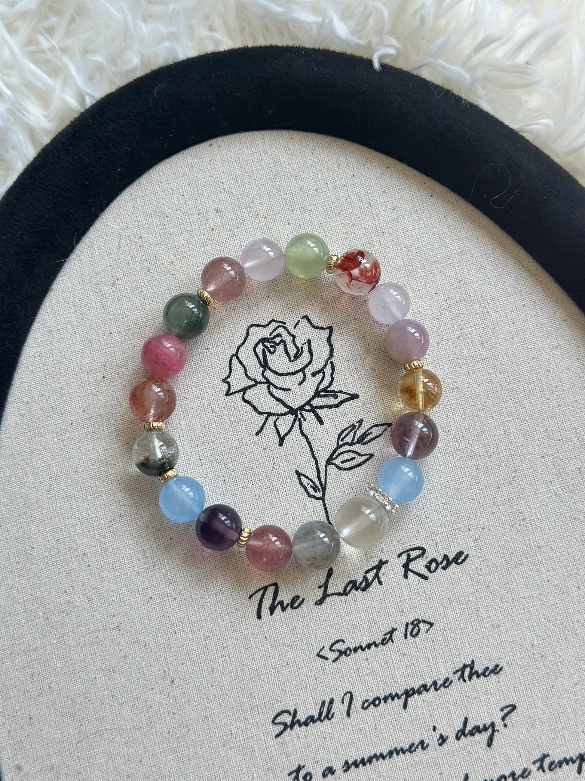 Step into the Aurora Garden, where light and color bloom in perfect harmony. This handcrafted bracelet features a radiant spectrum of natural crystals, each carefully selected for its beauty and meaning. From calming amethyst and loving rose quartz to energizing citrine and grounding tourmaline, every bead tells its own story — yet together, they form a unified garden of light.