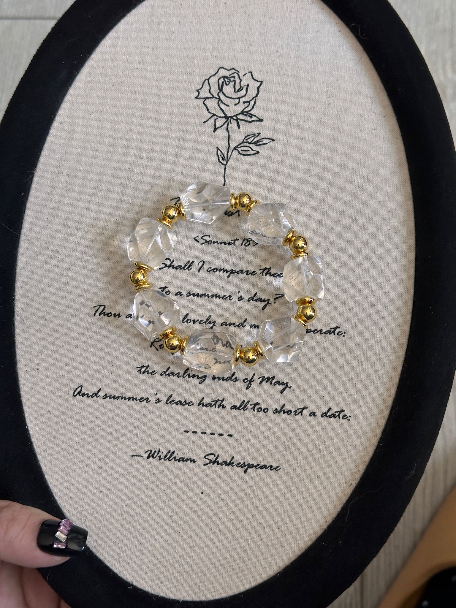 A bracelet that speaks the language of love, inspired by Shakespeare’s timeless words. The clear crystals symbolize pure devotion, while the golden accents represent the warmth and strength of everlasting affection. Just as a sonnet captures love in verse, this piece captures it in beauty—an elegant reminder that true love shines beyond time and season.