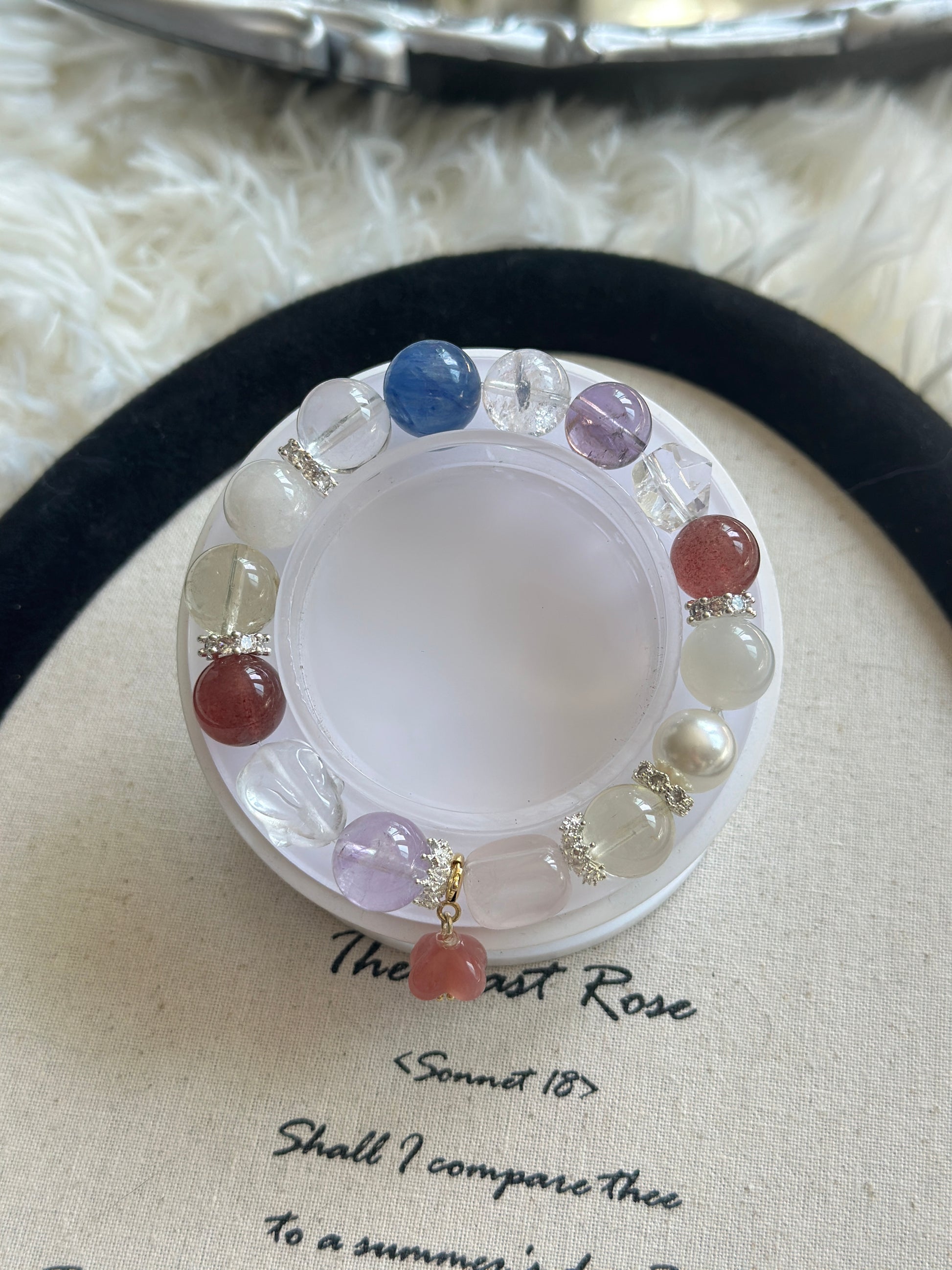 Bask in the gentle glow of Moonlit Bloom, a handcrafted crystal bracelet inspired by quiet moments and soft starlight. Adorned with a luminous mix of rose quartz, amethyst, kyanite, moonstone, and other healing crystals, this piece radiates calm, clarity, and grace.